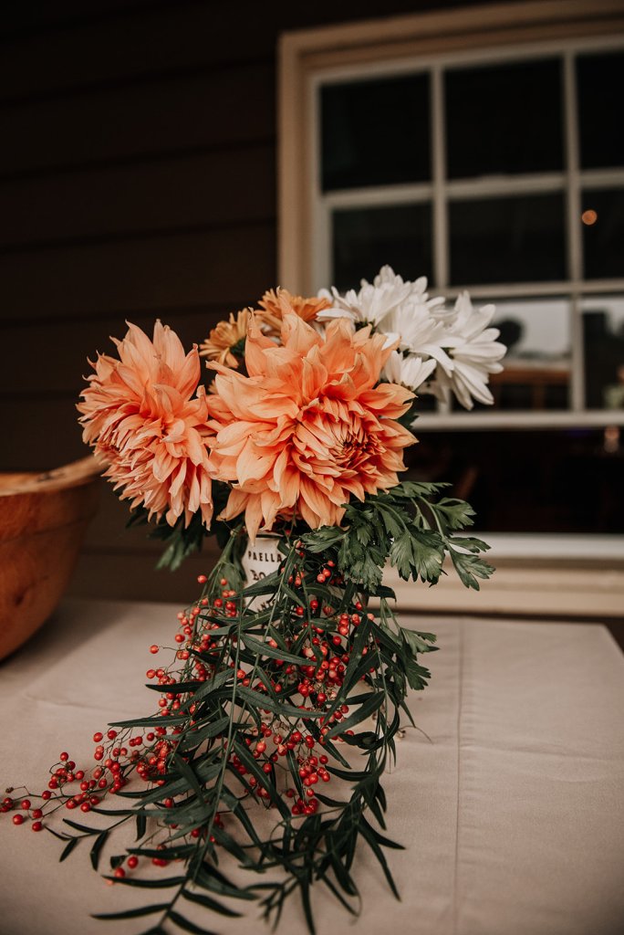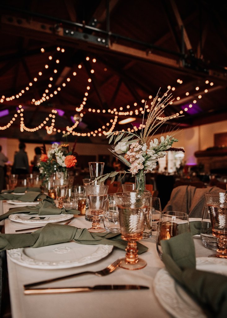 The Stinson Beach Community Center was the perfect indoor/outdoor venue for the couple’s dream reception. The high wooden ceiling and patio with coastal plants and Edison lights set the perfect ambiance for sipping cocktails in the coastal air. The dining room was even more beautifully decorated, with bursts of vibrance from floral