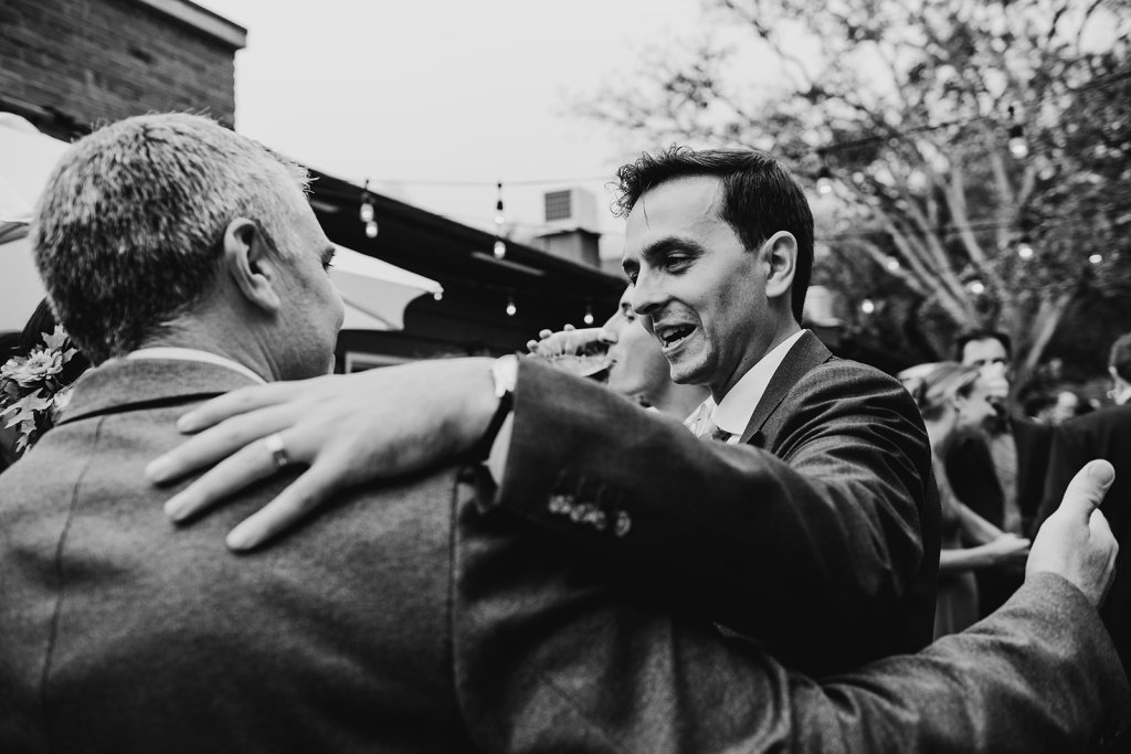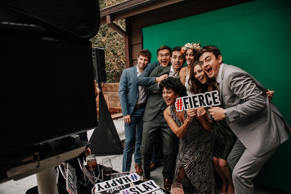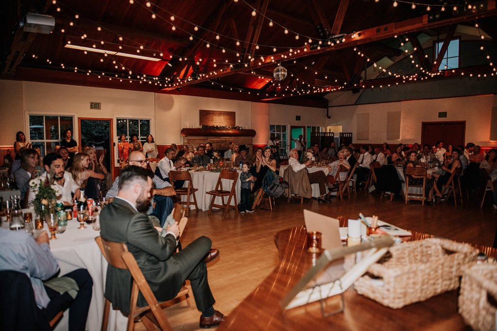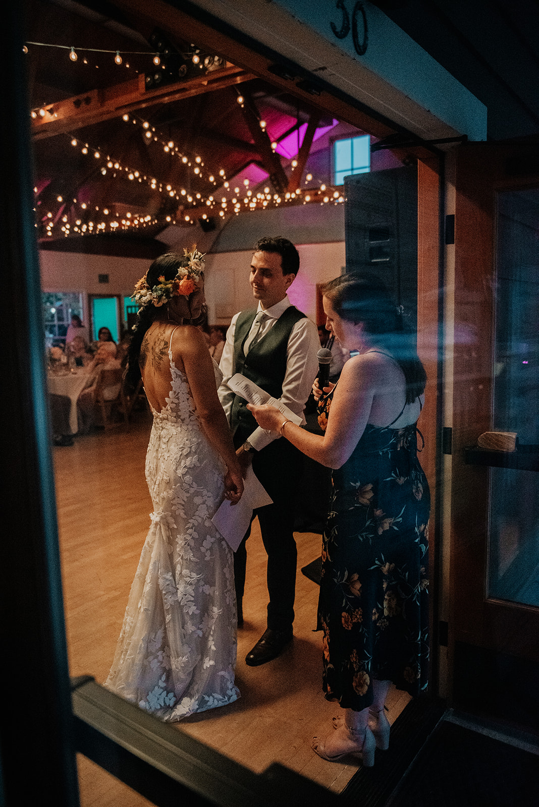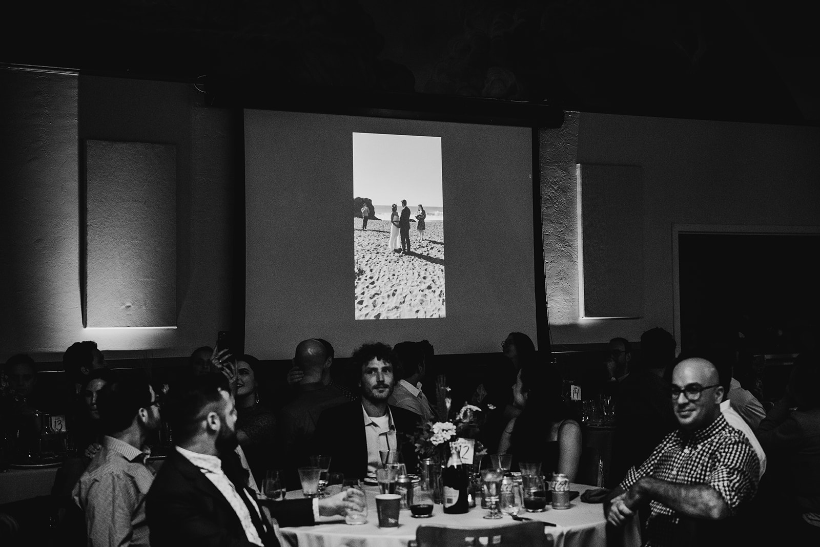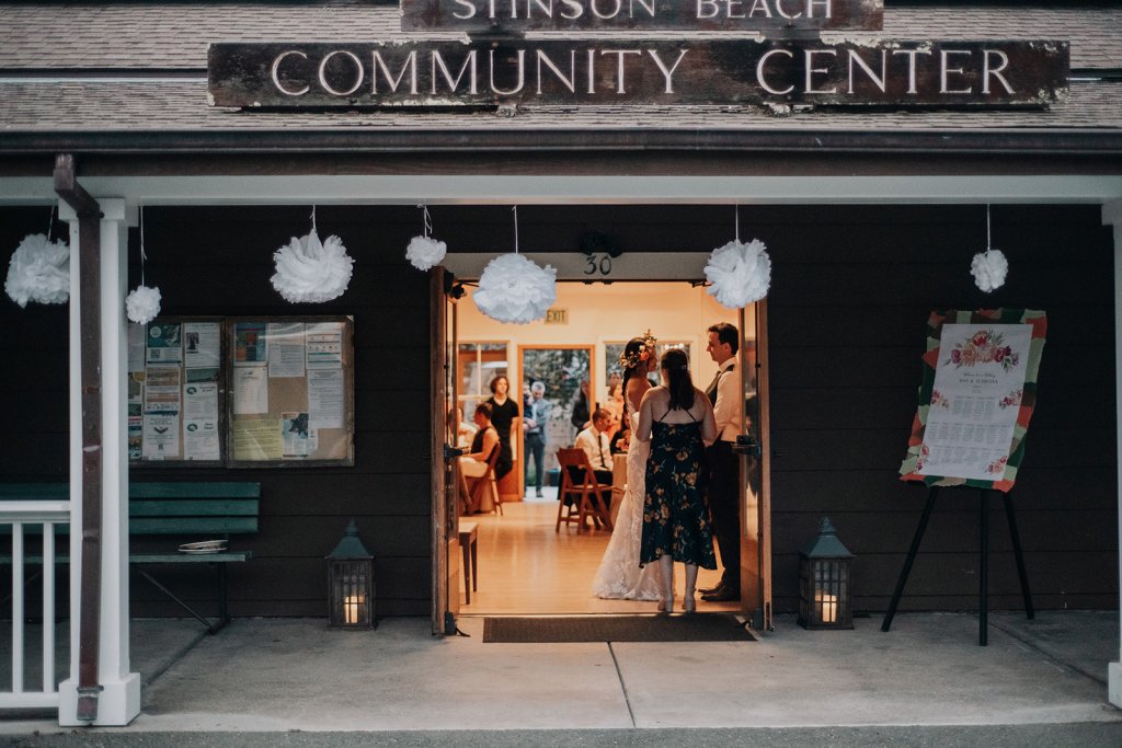 The couple had a special surprise for their guests – a video playing on a projector of their beach wedding vows. As they reenacted the moment in the doorway of the Stinson Beach Community Center, everyone got to relive the moment together. It was the sweetest thing ever.